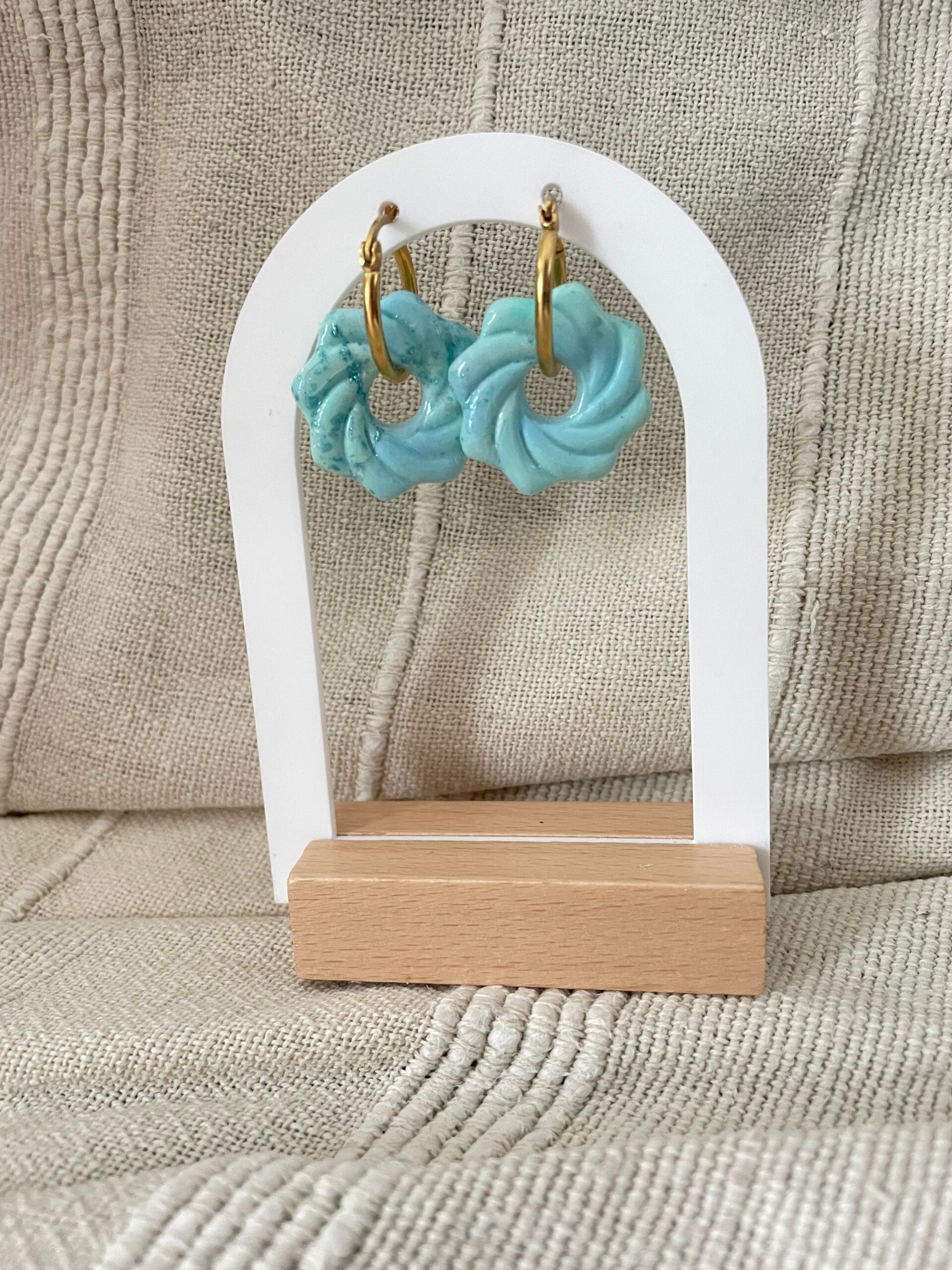 La pampille spirale séduit par sa forme délicate et son mouvement léger. Entièrement façonnée à la main en pâte polymère, elle apporte une touche originale et moderne tout en restant facile à porter au quotidien.